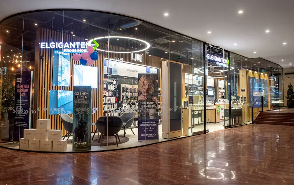 Elkjøp 3.0 koncept med kombination av varma och kalla färgtemperaturer, olika typer av belysning med både grund- och effektbelysning samt dekorativa objekt
